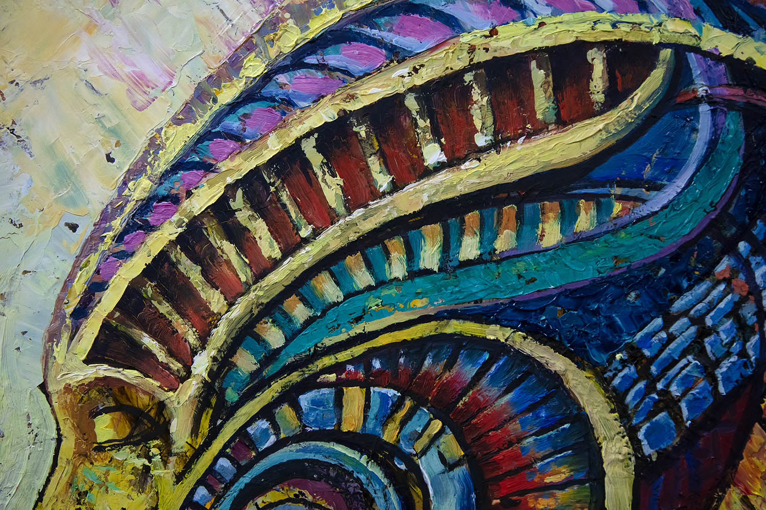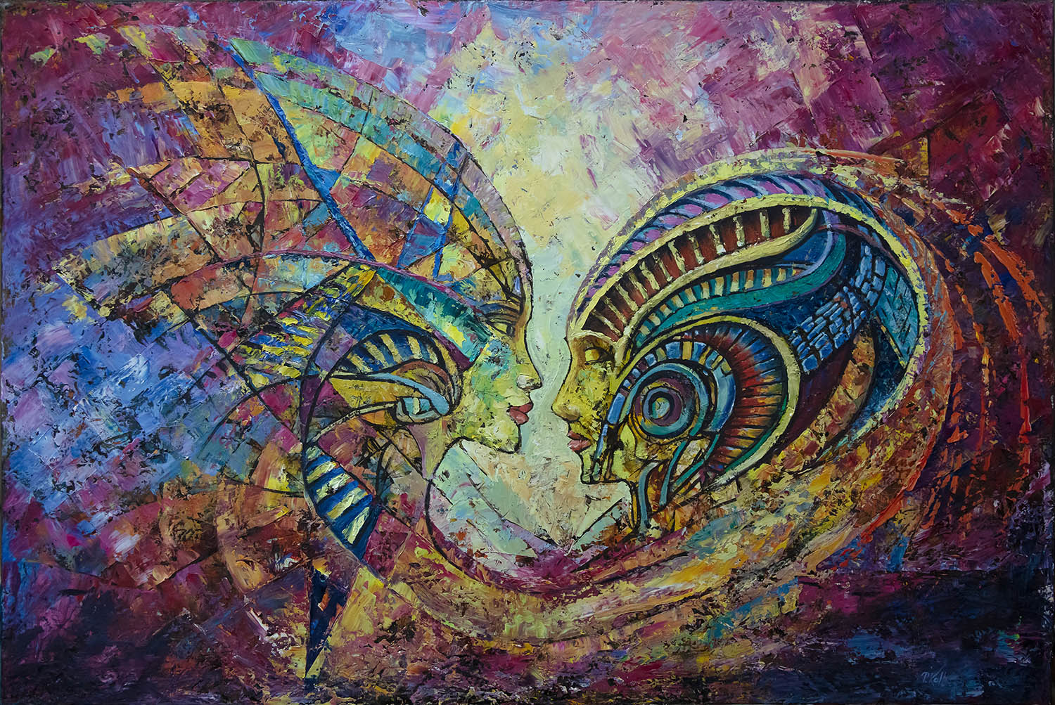 Hier wird der Kuss zur kosmischen Begegnung. Zwei futuristische Köpfe neigen sich einander zu, wobei ihre Formen im Moment der Annäherung energetisch verschmelzen. Die dynamische Pinselstrichführung und die leuchtenden Farben fangen die emotionale und physische Intensität dieses fundamentalen menschlichen Moments ein.